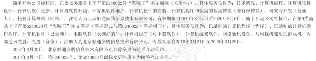 In what seemed more than a mere coincidence, just one month later, in August 2007, a Beijing-based entity called Troodon Entertainment Technology Ltd. (北京触通安腾) filed for the 海贼王 trademark. That same month, the studio rebranded itself as 随手互动 (Suishou Interactive). In March 2010, the Pirate King trademark was approved under NICE Classes 9 and 42—two months before Shueisha’s Navigator King received approval in May 2010. The most beloved name had slipped through the IP holder’s fingers. The precise timing mentioned by multiple public resources brought up many questions. Was Troodon actively monitoring the trademark application process and/or the official IP licensing news related to One Piece? Was it an internal leak from Shueisha? Why was a later application approved two months earlier than a preceding one after three years? We can never know. But what we do know is that Shueisha’s 2013 legal challenge to reclaim 海贼王 proved futile, rejected due to Troodon’s squatting. Following the legal battles, the stolen trademark was transferred from Troodon to Suishou in 2014, officially consolidating under the renamed entity.